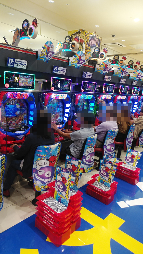 1円・0.2円のパチンコ低貸しコーナーでは、幅広い年代のプレイヤーの楽しそうに遊技する姿が見られ、コーナー全体が明るい雰囲気に包まれていた。その中でも人気が高かったのは海物語シリーズで、空台はほとんど見当たらない状況となっていた。