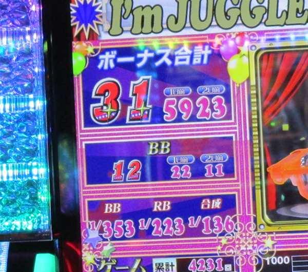 5割以上が稼働している状況の「アイムジャグラーEX-AE」で、プレイヤーたちがパフォーマンスを披露。鮮やかな光景にくわえて、ボーナス合算確率が1/136の台も確認している。
