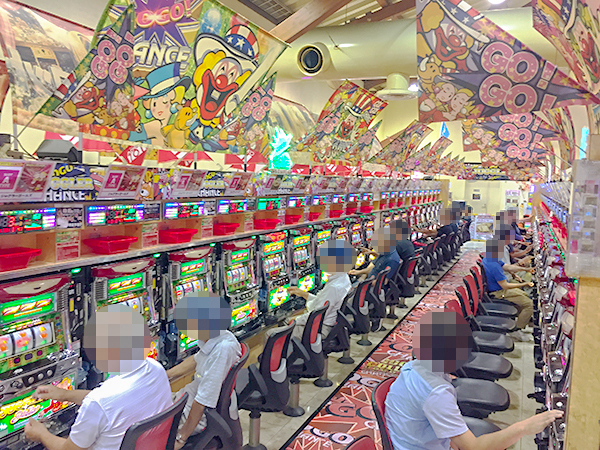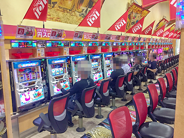 取材時の店内には多くのプレイヤーが来店。パチンコ・パチスロ共に、様々な機種が支持を集めていた。
