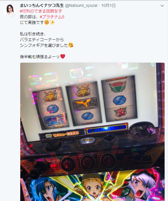 バラエティコーナー担当のまいっちんぐナツコ先生は、『パチスロエウレカセブンAO』で実戦開始。