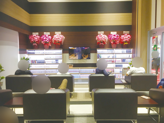 なかなか空き台が見つからない時は1,600冊もの漫画本が設置された休憩スペースが大活躍!