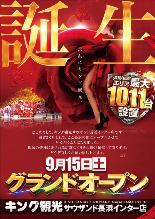 東海エリアで名を轟かすキング観光グループが、総設置台数1011台の「キング観光サウザンド長浜インター店」を2018年9月15日(土)滋賀県長浜市にオープンさせた。