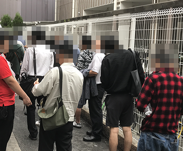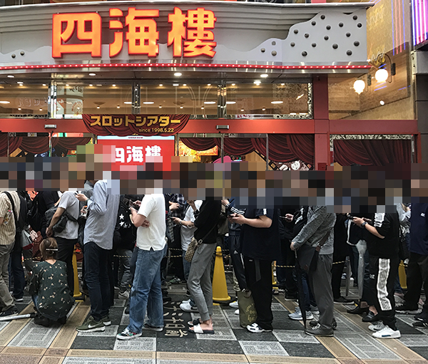舞台となったのはパチスロ専門店である「スロットシアター四海樓」。人通りの多いホールの前には朝から240人前後のプレイヤーが集まっており、にぎやかな待機場所の様子からは期待感が伝わってきた。