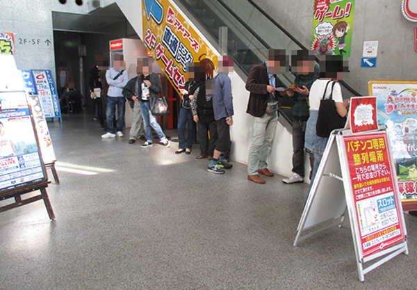 朝イチの入場方法は並び順となっており、パチンコとパチスロを合わせて30名ほどのプレイヤーが集合。また、開店時間に合わせて来店するプレイヤーも多くみられた。