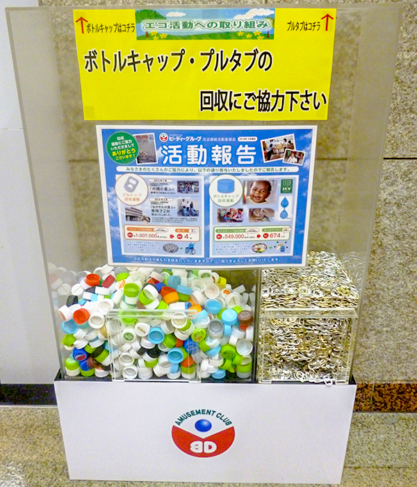 同店では社会貢献活動を推進。ワクチンや車いすの寄付のため、ペットボトルキャップやプルタブを回収していた。