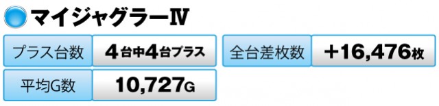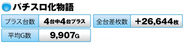 また『パチスロ化物語』を筆頭に、『マイジャグラーIV』『マジカルハロウィン5』『パチスロコードギアス反逆のルルーシュR2』の4機種14台が全台プラスに。