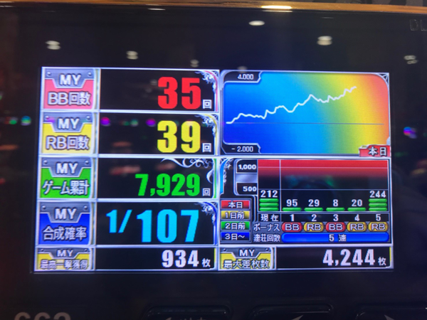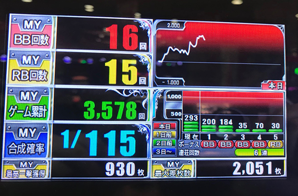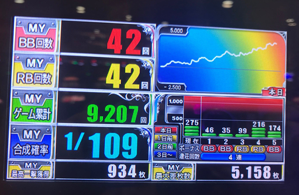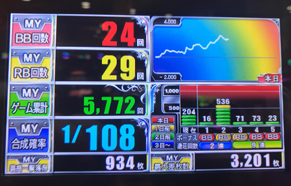 1日を通して、高いボーナス合算確率をキープするなど、驚くほどのペースで出玉を増やしたにわか仁。BIGとREGの合計は80回を超え、ヒキの強さではこれ以上ない活躍をみせていた。