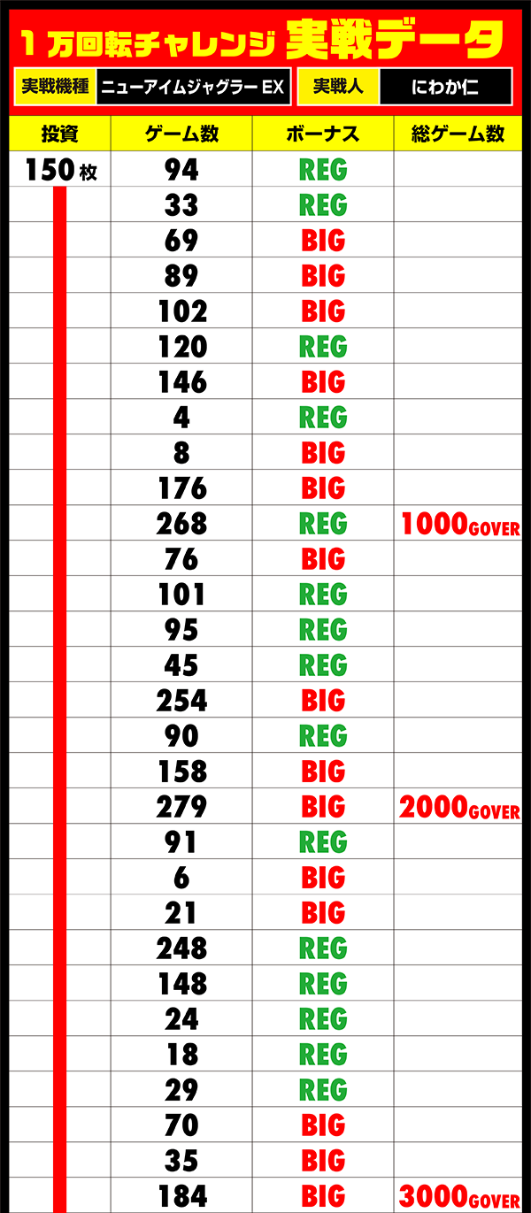 「ニューアイムジャグラーEXーKT」で挑戦を開始すると、序盤からボーナスのヒキが絶好調。勢いは増し続け、15時頃のデータカウンターの表示は30回を超えていた。