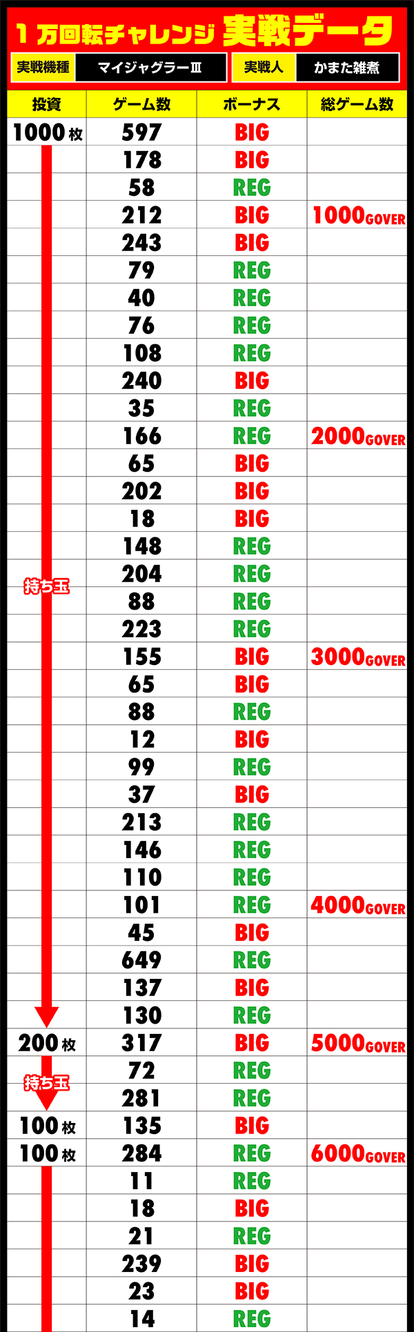 結局は大量の出玉を獲得したが、400Gちかくも残してチャレンジ終了となった。