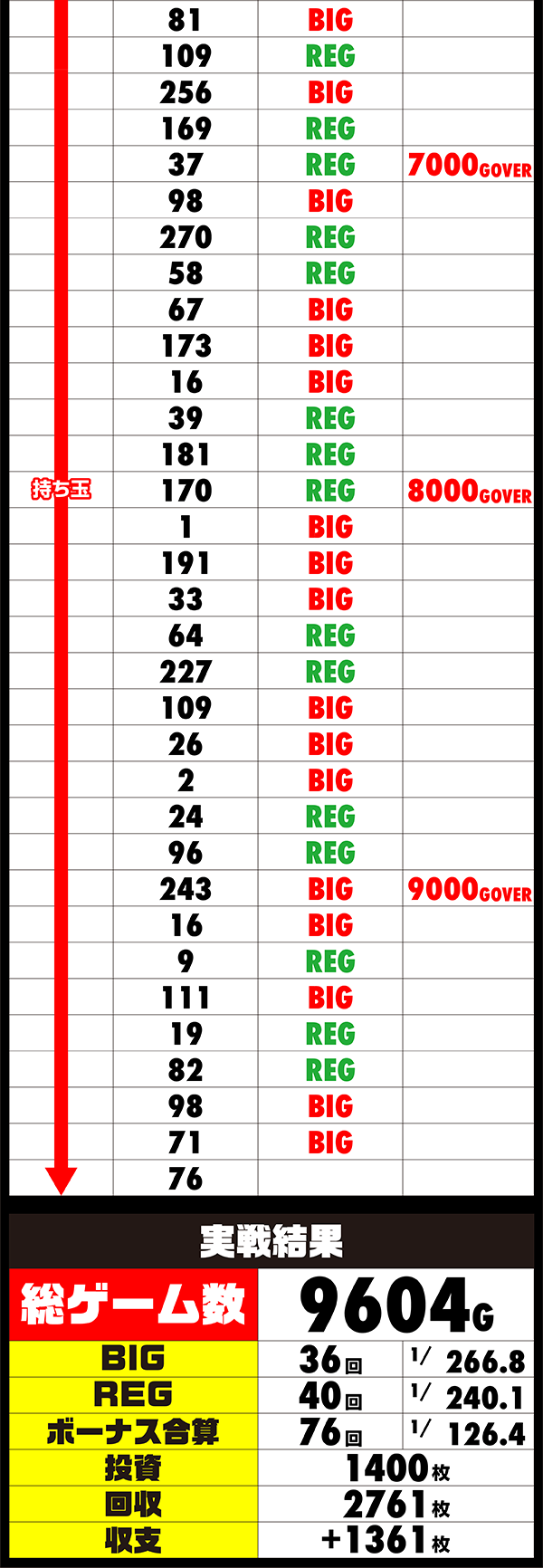 中盤からはコンスタントにボーナスを引いて出玉を伸ばしたものの、やはり思ったようにゲーム数は伸びず…。