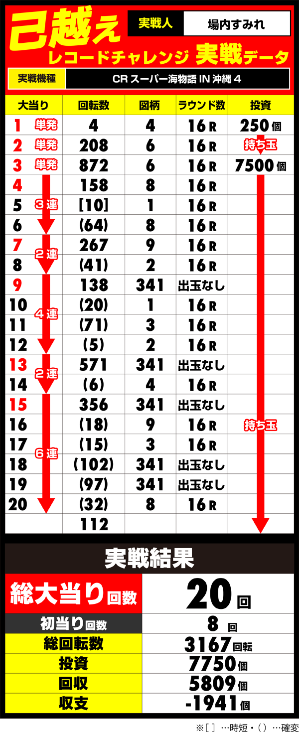 しかし、大当り回数42回以上という高いハードルを越えるには時間が足りず、20回目の大当りを獲得したところでタイムアップ…。