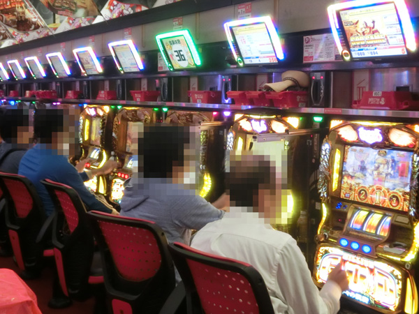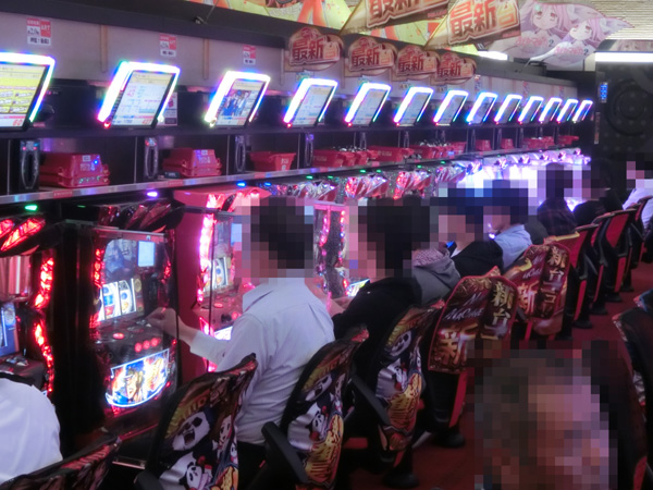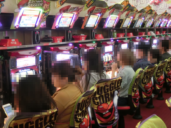 ボーナスタイプコーナーからは定番のジャグラーシリーズがにぎやかな状況。女性プレイヤーの姿も多く見られ、明るい雰囲気となっていた。
