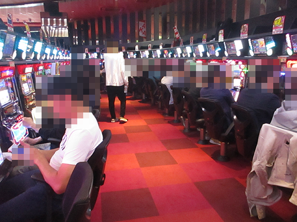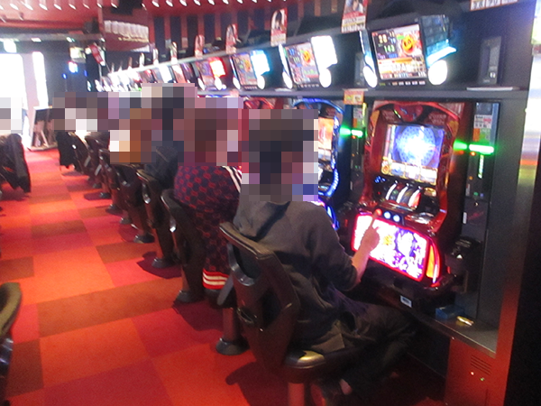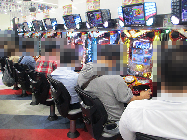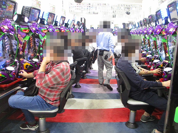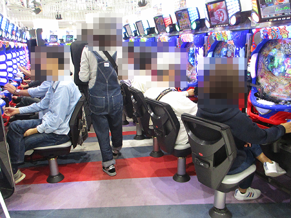 パチンコのなかで、とくに活況であったのが海物語シリーズと「CRヱヴァンゲリヲン 2018年モデル」。いたるところにうれしそうなプレイヤーを確認している。