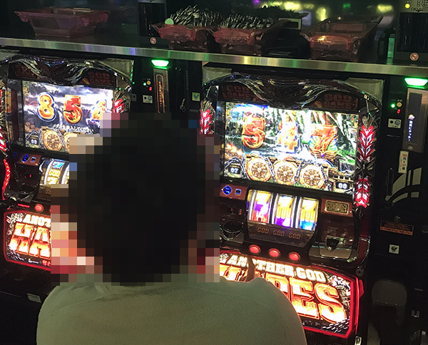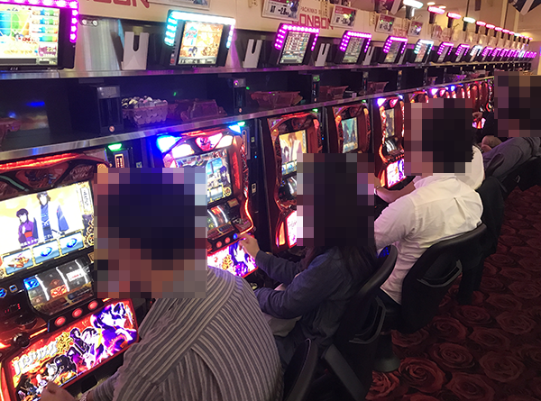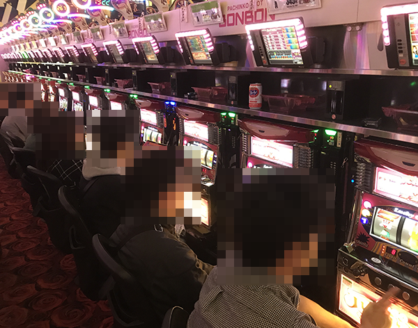 「バジリスク~甲賀忍法帖~絆」やジャグラーシリーズなど、パチスロコーナーのさまざまな機種に明るい光景を確認。
