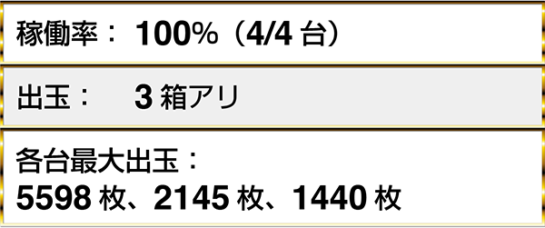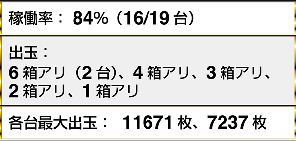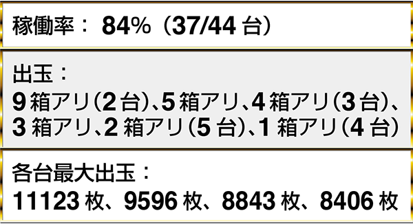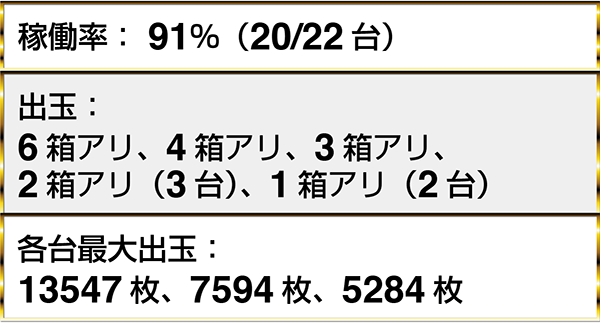 『ミリオンゴッド-神々の凱旋-』や『押忍!番長3』、『アナザーゴッドハーデス-奪われたZEUSver.-』の3機種で10000枚を超える最大獲得出玉を確認した。