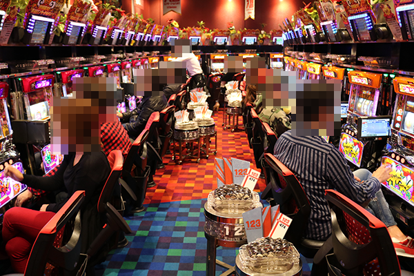 パチスロコーナーでトップクラスとなる設置台数かつ高稼働のシマは壮観だ。