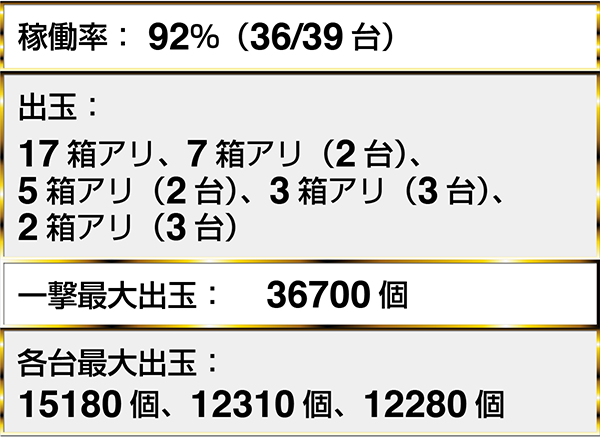 14時の時点で、もっとも多かった一撃獲得出玉は『ぱちんこCR真・北斗無双』の36700個。