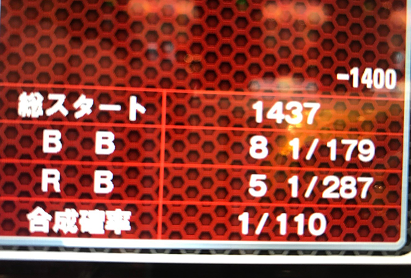 開始直後からテンポよくBIGとREGを獲得し、12時頃までに13回のボーナスを獲得。総ゲーム数は約1400Gと、あまり通常時を消化できてはいないが、出玉面では快調なスタートをきっていた。