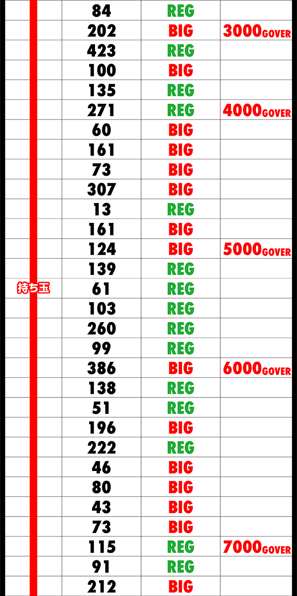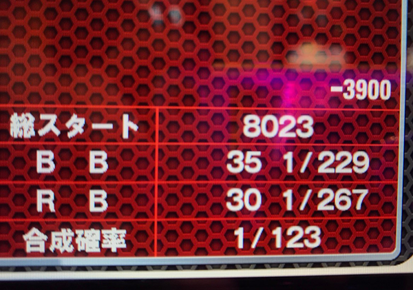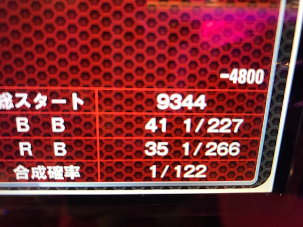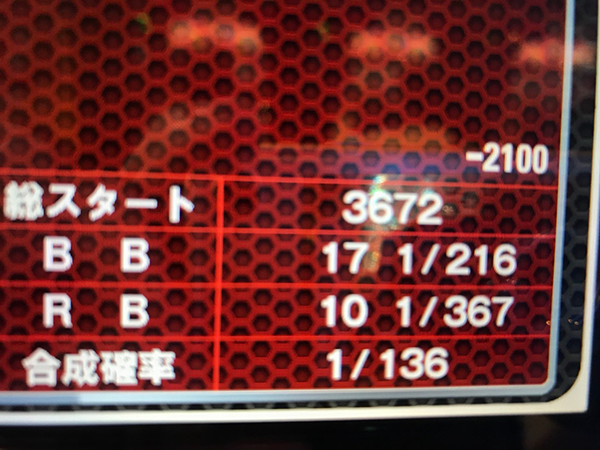 夕方頃にはボーナス確率が低下したことで、レバーを叩くスピードも自然とアップ。それでも18時の時点で5900Gに到達したばかりと、やはり1万回転を目指すにはかなり苦しい展開だ。