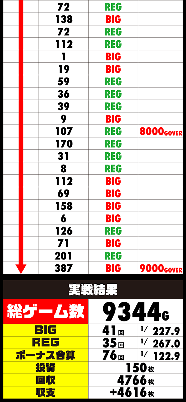 1日を通してボーナスを引き過ぎてしまい、最終的には600G以上を残してチャレンジ失敗となった。
