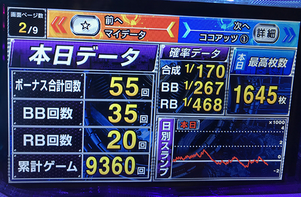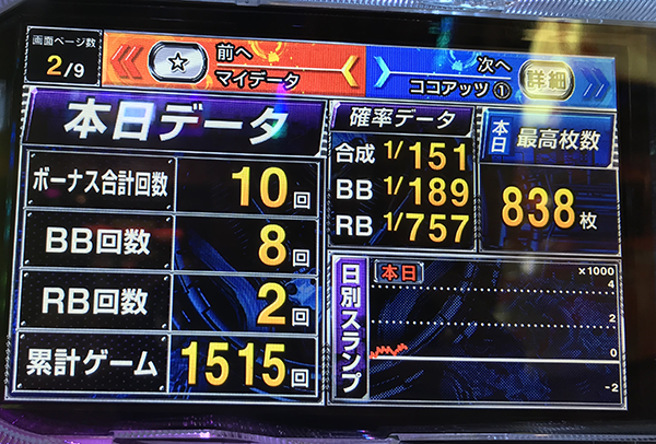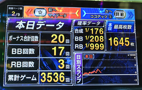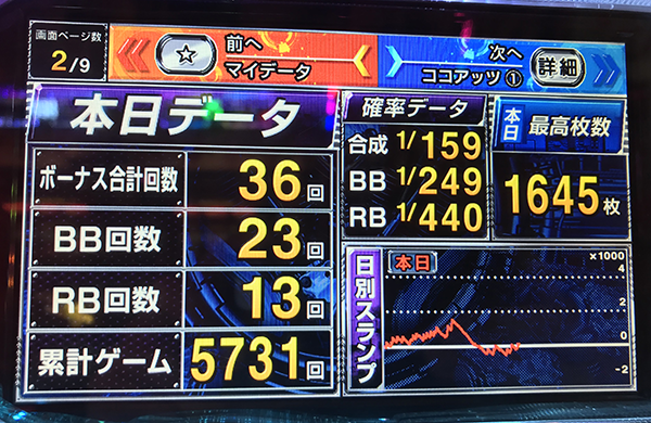 通常時を消化する機会が増えたことを利用して、一気にゲーム数を稼ぐかと思われたのだが、12時頃の総ゲーム数は約1500Gといたって平凡。