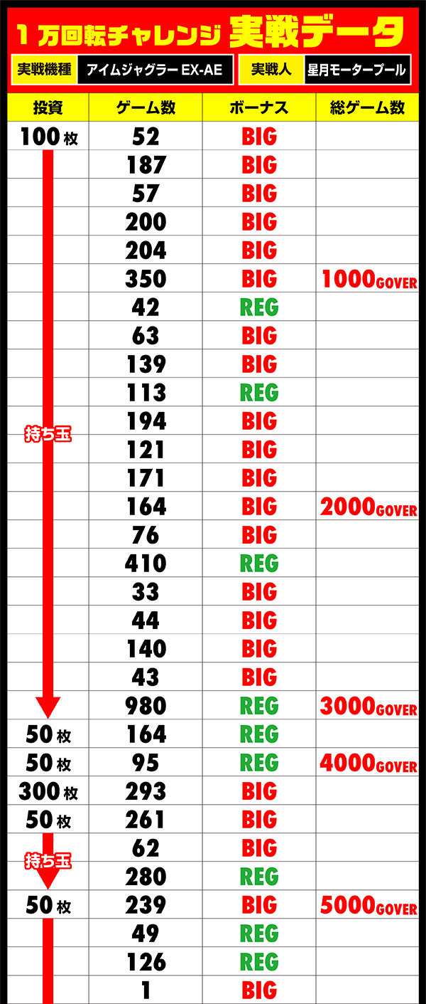 「アイムジャグラーEX-AE」で挑戦をスタートすると、序盤からボーナスのヒキが悪い。