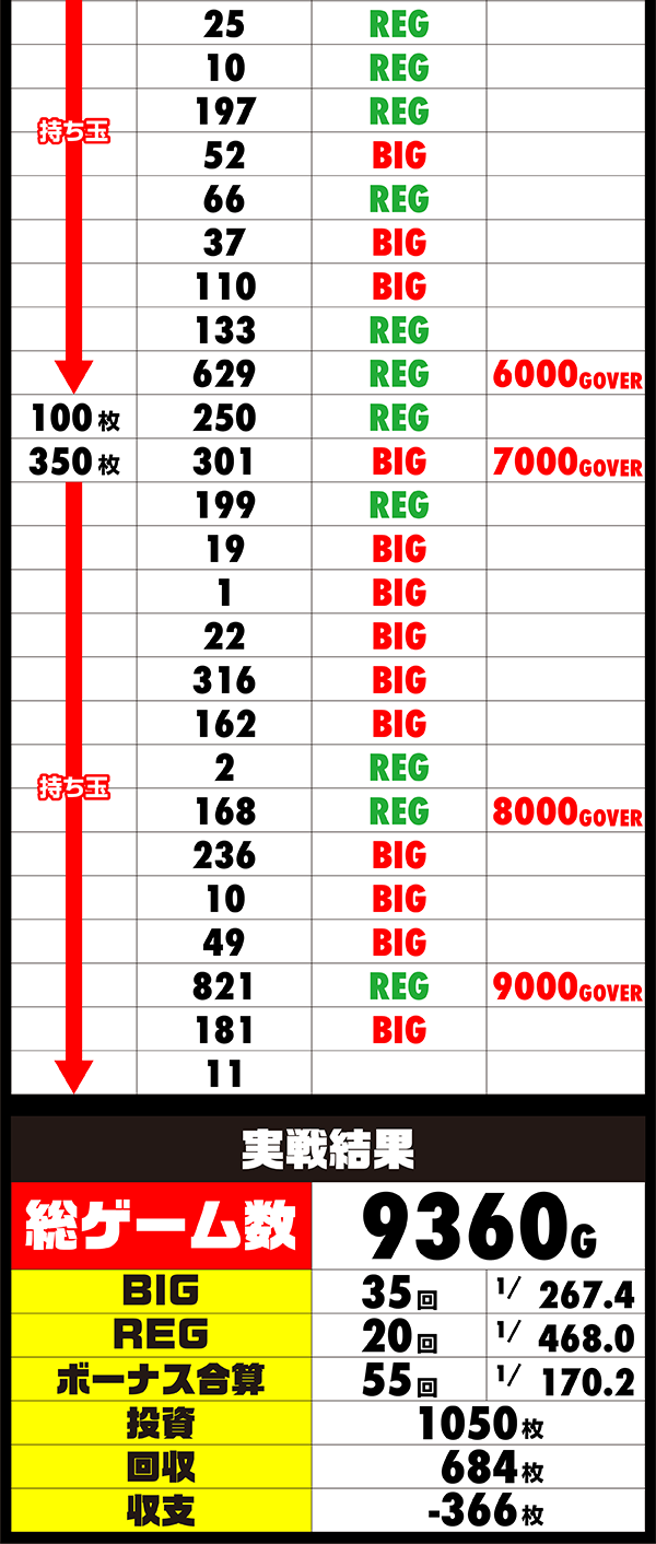 1日を通してゲーム数を稼ぎやすい展開であったにもかかわらず、600G以上を残してチャレンジ失敗となってしまった。