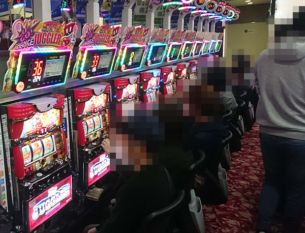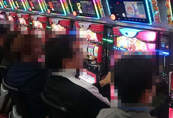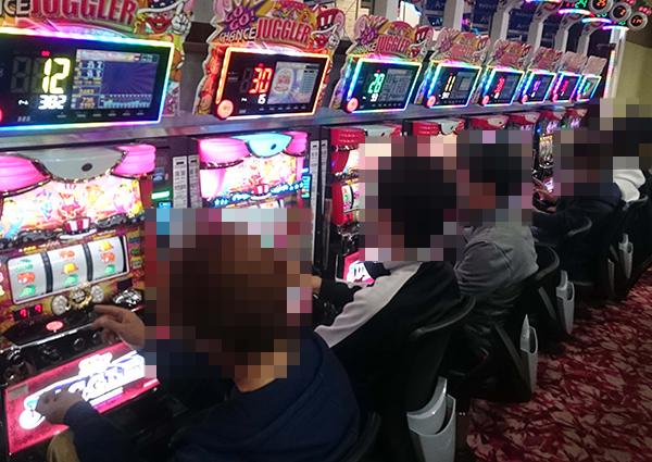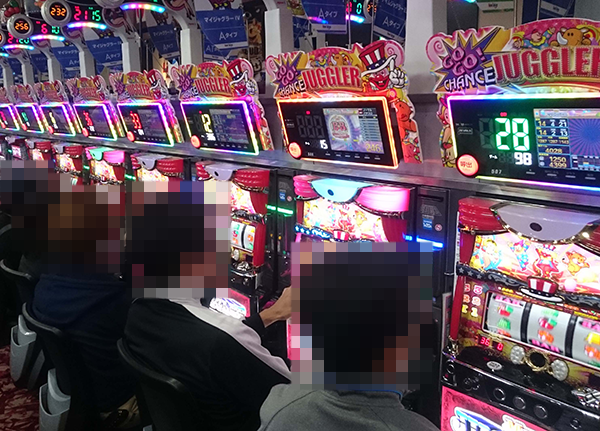 多くの機種が楽しまれている状況において、とくに人気を集めていたのがジャグラーシリーズ。イキイキとした笑みを浮かべつつ、楽しそうにレバーを叩くプレイヤーたちの姿が印象に残っている。