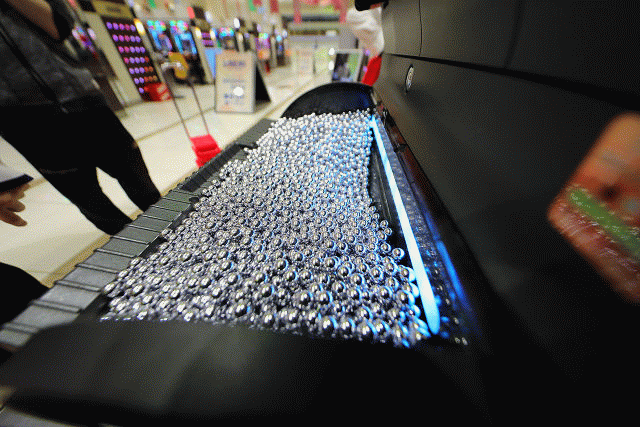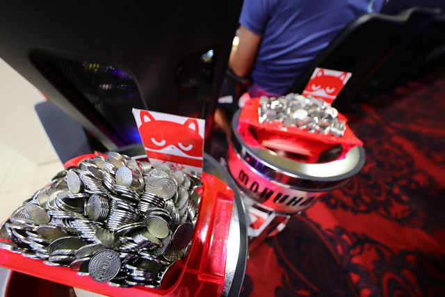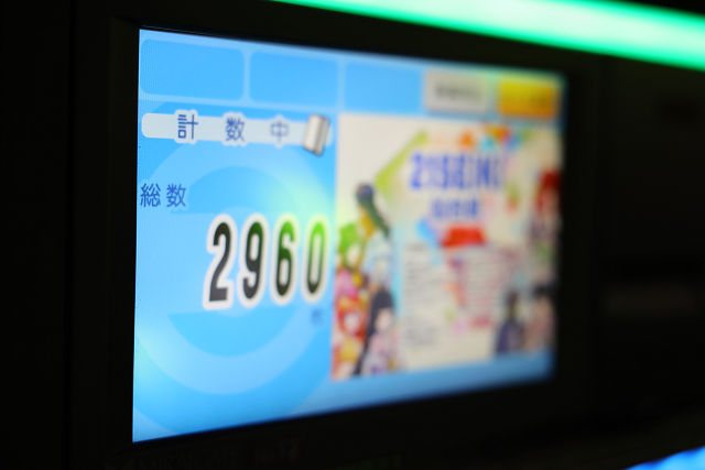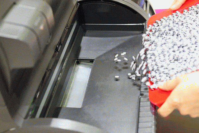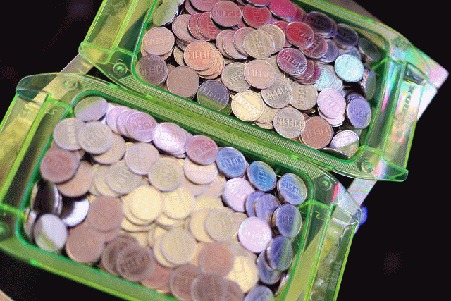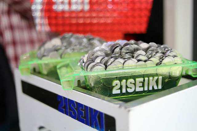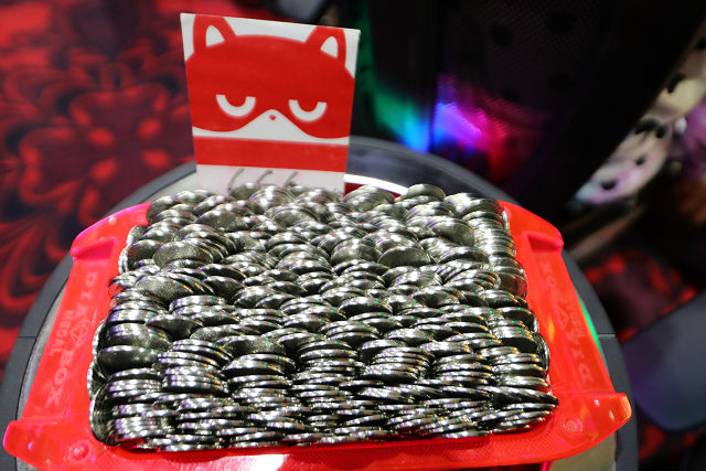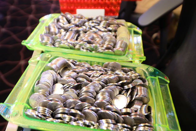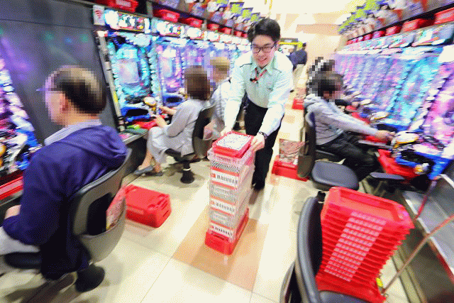 ファンによって作られたドル箱タワーが、スタッフにより丁寧に流し込まれる。