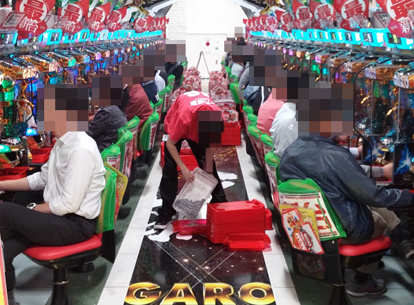 4円パチンコでは「CR牙狼 魔戒ノ花」がフル稼働状態となっており、パチンココーナーの中心と言っても過言ではないほど盛況となっていた。