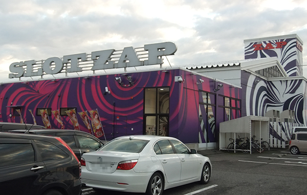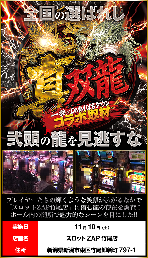 紫を基調とした色鮮やかな外観も特徴的な「スロットZAP竹尾店」を舞台に「真双龍」を敢行。