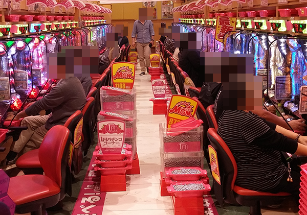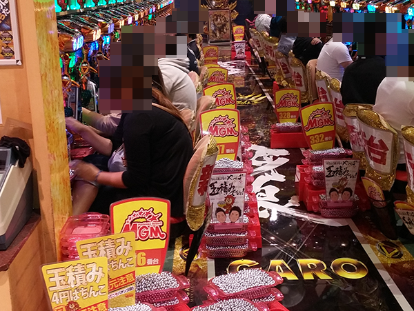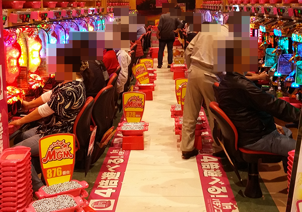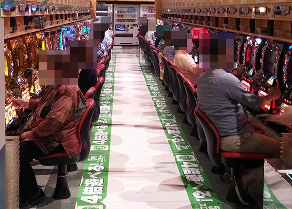 午後の4円パチンコをみると、「CR牙狼 魔戒ノ花」が最も盛り上がっており、ほとんど満席。