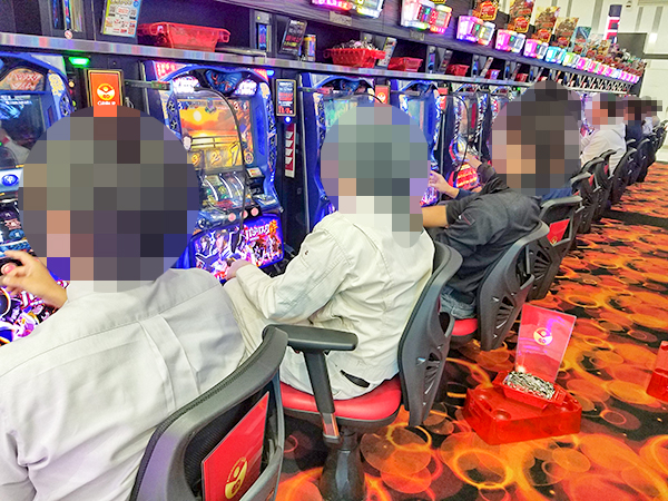 5円パチスロは機種を問わず好評。楽しそうにレバーを叩くプレイヤーが多かった。