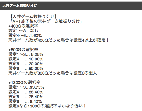 ART終了後の天井ゲーム数の振り分けにも設定差があり、400Gが選ばれれば設定4以上が濃厚となる。設定6は800Gの選択率が高いことも覚えておこう。