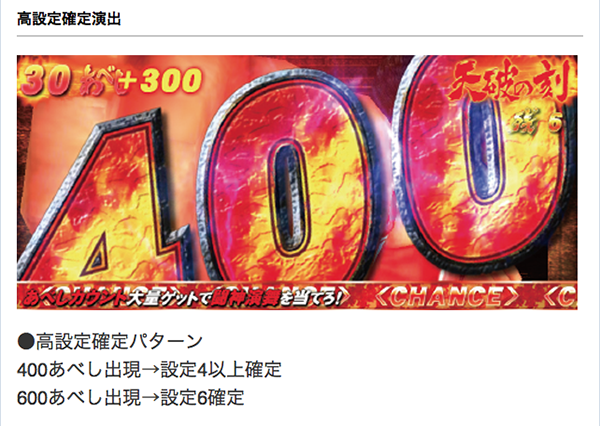 天破の刻中に出現するあべし数にも注目。400あべしならば設定4以上、600あべしであれば設定6が濃厚だ。