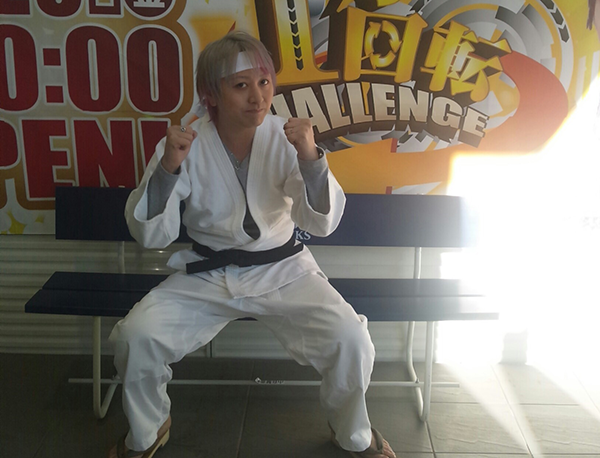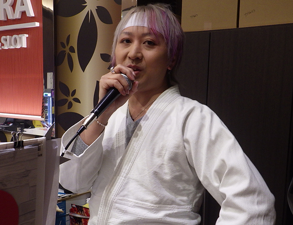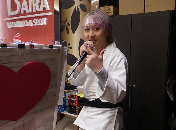 色鮮やかな髪に気合いのはいった道着、ピンクのネイルと、どこからつっこんでよいのかわからないほどにインパクトがある格好で登場! このホールでの1万回転チャレンジは自身初となるだけに、みた目だけでなく、華麗なパフォーマンスでもアピールしてもらいたい。