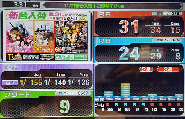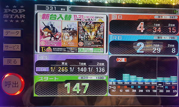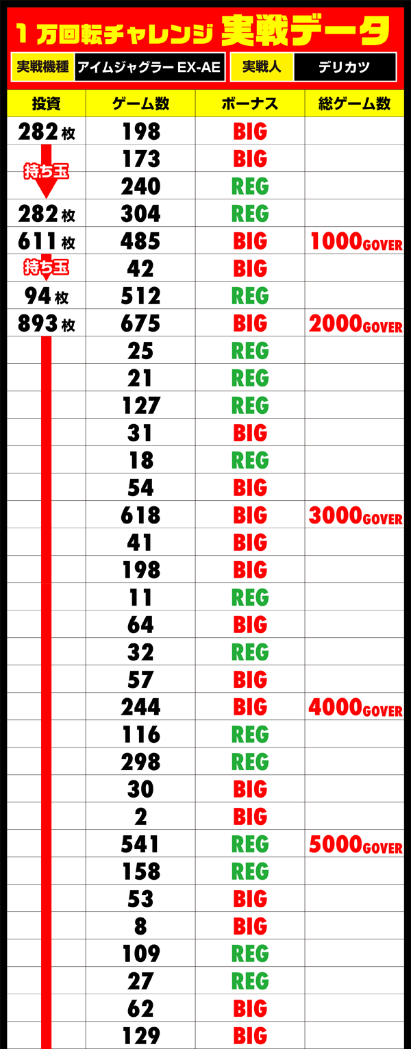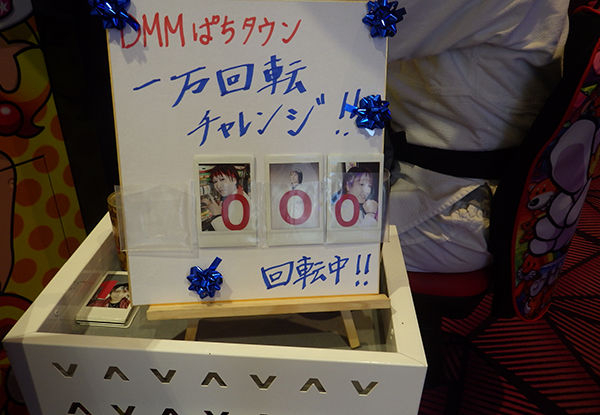 朝イチからたくさんのプレイヤーに声をかけてもらい、楽しそうに挑戦をおこなうデリカツ。500Gや600Gの微妙なハマリがチャレンジ成功の追い風となり、15時頃には3900Gを消化と、順調なペースで回転数を稼いでいた。