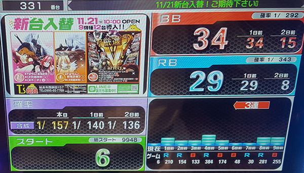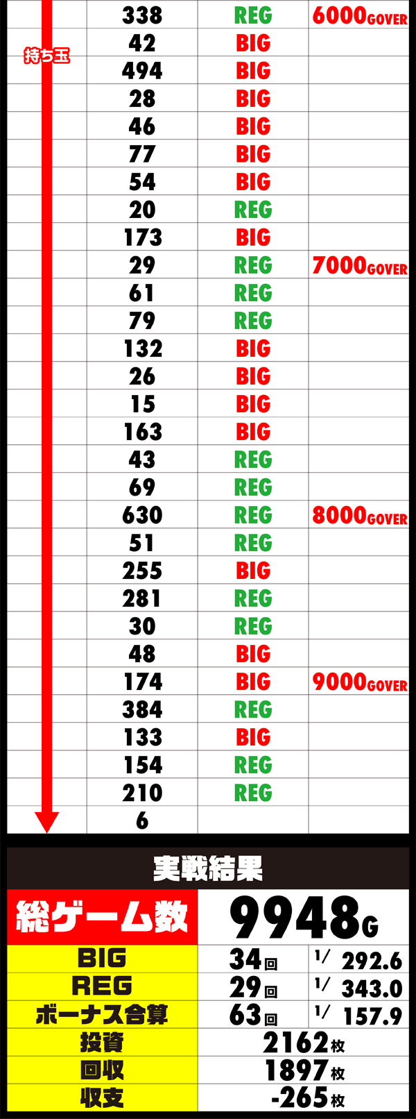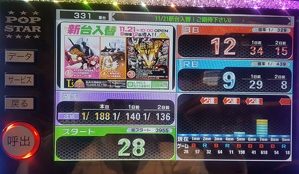 時間の経過とともにボーナス確率が上昇し、18時を過ぎた頃から通常時の消化スピードが徐々にダウンしてしまう。成功に期待が持てる展開から一転し、チャレンジ失敗のビジョンがチラつきはじめた。