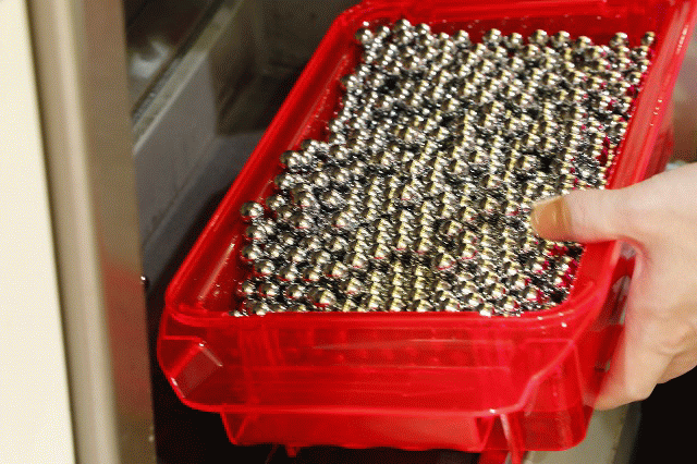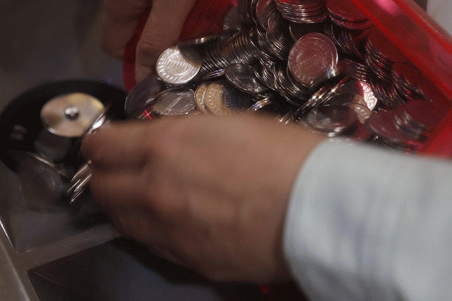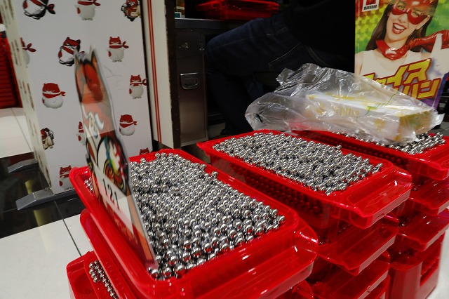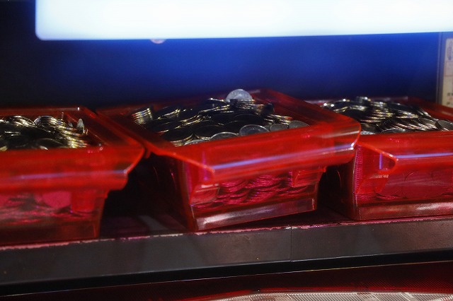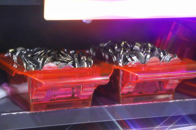 台の頭上には、メダルがぎっしり詰め込まれたドル箱!