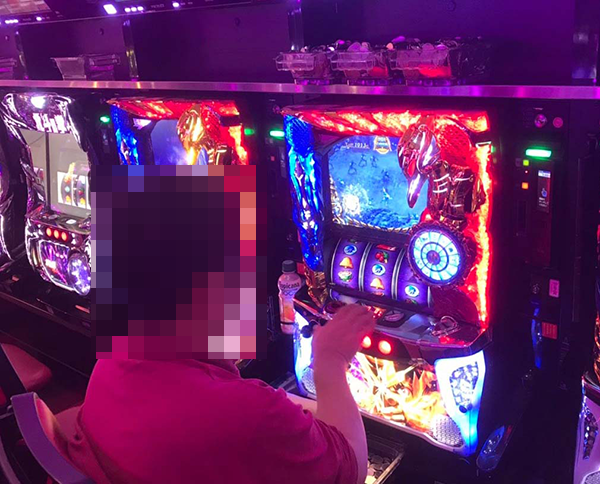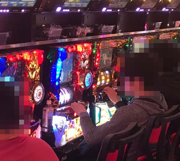 喫煙フロアに4台が設置されている「パチスロ聖闘士星矢 海皇覚醒」にて、機種の性能を最大限まで引き出しているといった姿を発見。