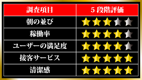 遊技台の周辺はもちろん、通路やトイレまで清掃が行き届いているホール内は居心地も抜群。また、丁寧な接客をおこなうスタッフの存在もあり、遊技に集中できる環境もしっかりと整っていた。