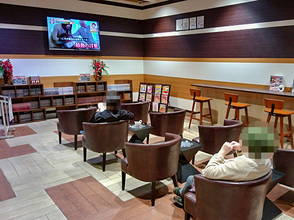 レストスペースには大型テレビ・漫画本・雑誌が用意されており、取材時も満喫するプレイヤーが多かった。