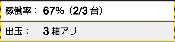 17時頃のパチスロコーナーでは、『ゴーゴージャグラー』と『パチスロ笑ゥせぇるすまん3〜笑撃のドーン〜』が満席。半数以上のプレイヤーが持ち玉で遊技を楽しんでおり、4箱を超える出玉も確認した。