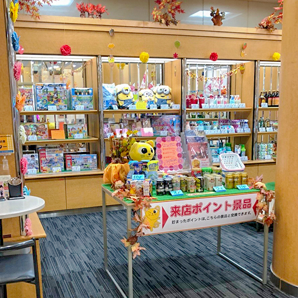 景品コーナーには来店ポイントで交換できるアイテムが用意されており、プレイヤーたちの視線を集めていた。