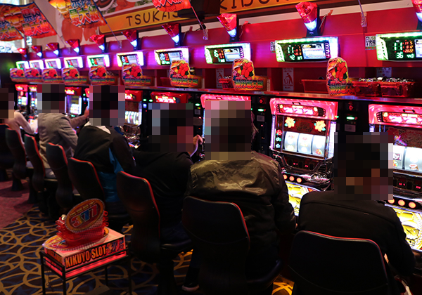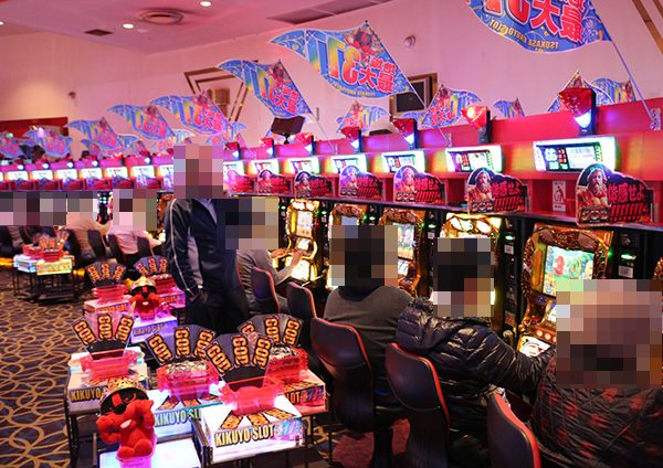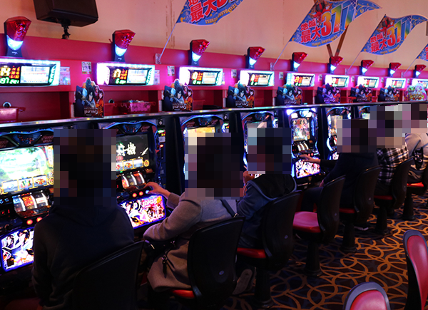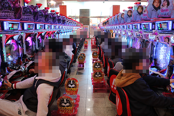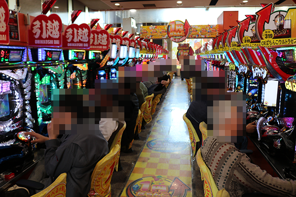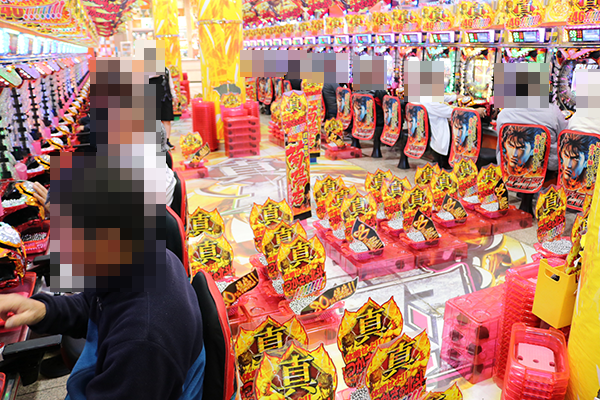 4円パチンコのなかで、とくに注目されていたのが「ぱちんこCR真・北斗無双」。満面の笑みを浮かべているプレイヤーが目立ち、シマ内には華やかな光景が広がっていた。
