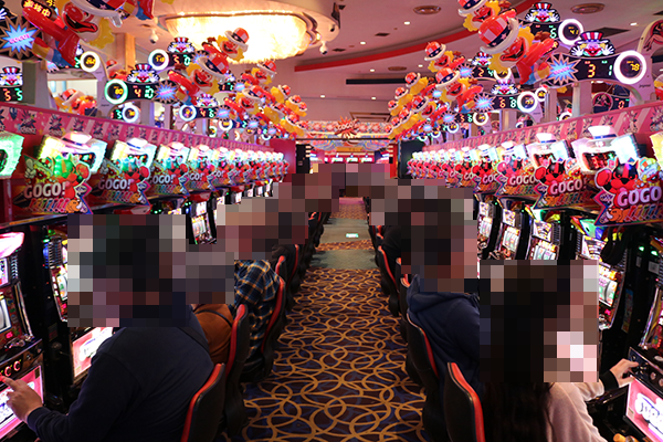 ジャグラーシリーズの稼働率も高く、シマ内に広がる光景は華やかだ。