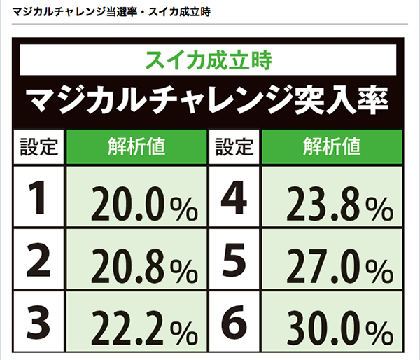 スイカからのマジカルチャレンジ確率や通常時におけるART直撃確率も高設定ほど高い。