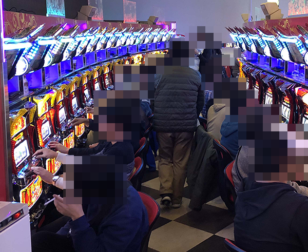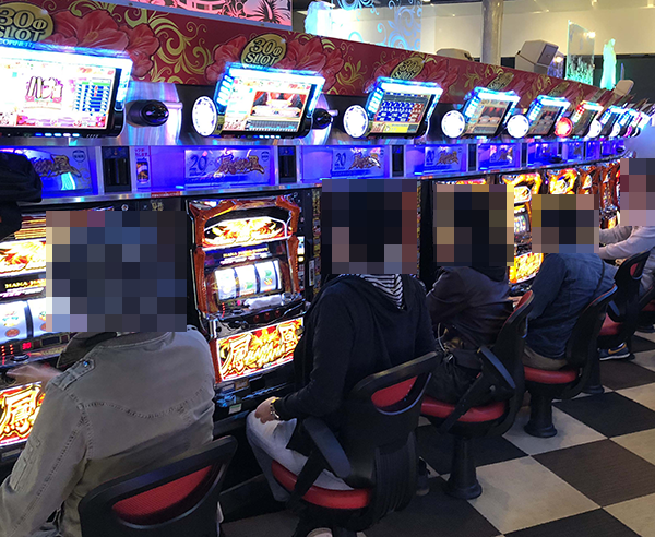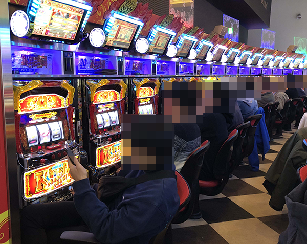 にぎわうパチスロコーナーにおいて、とくに目立っていたのは9台が設置されている「グレートキングハナハナ-30」。
