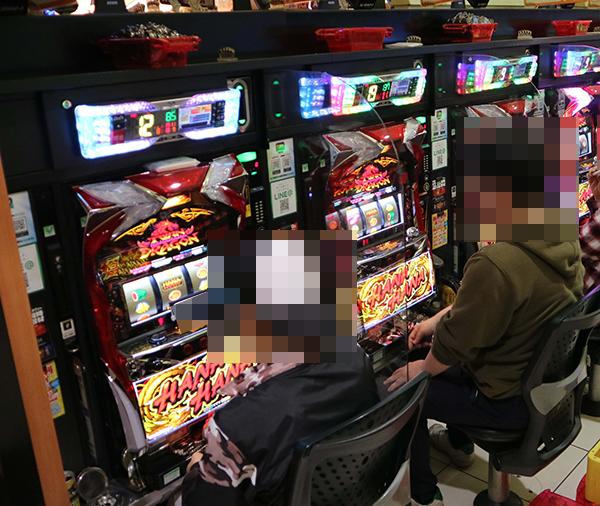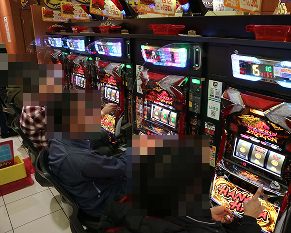 龍の存在を探るべくパチスロコーナーに向かうと、ハナハナシリーズが大盛り上がり。