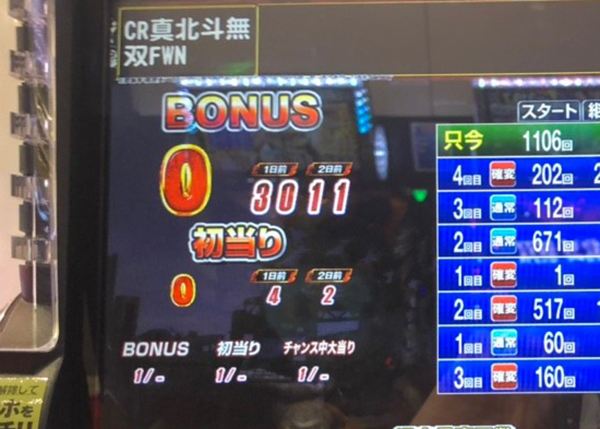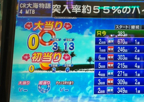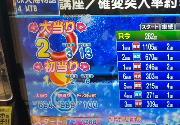 ホールに戻ったあとは、過去最高大当り回数が51回の「CR大海物語4」で再スタートをきるかまた雑煮であったが…。またもや当たることはなく、通常時の回転数だけがどんどん増えていく。